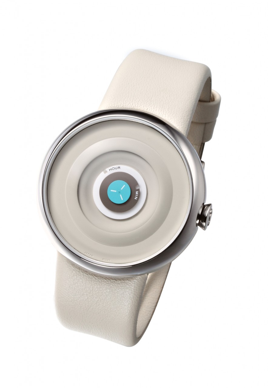 Tacs horloge uit de serie DROP-D. Dit horloge met moderne vormgeving heeft een hoge afgeronde kast en wijzerplaat met bewegende schijven om de tijd aan te geven. Met de disc als inspiratiebron.