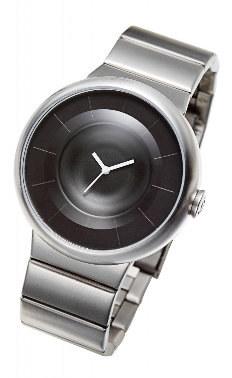 Dit strak vormgegeven horloge heeft een hoge afgeronde kast, een wijzerplaat in reliëf en een edelstalen band.