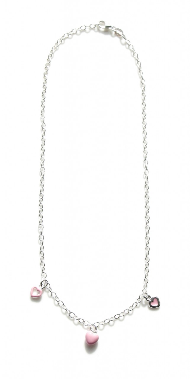 Kinder bedelketting met drie zilveren hartjes, de verschillende hartjes zijn bewerkt met roze emaille. De ketting is in lengte verstelbaar tot maximaal 38 cm. Bijpassend bedelarmbandje is tevens verkrijgbaar.