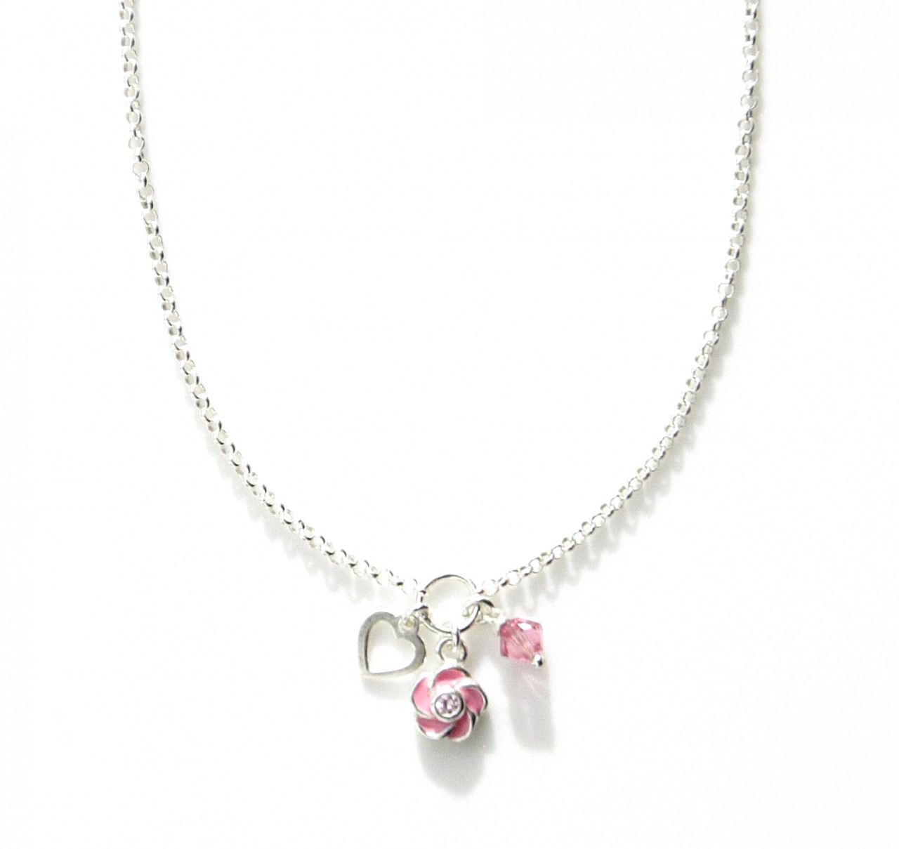 Zilveren kinderketting met triohangertje, een roze kraaltje, een zilveren bloemetje met roze emaille blaadjes en roze steentje en een open hartje. De ketting is in lengte verstelbaar van 35 tot 38 cm. De drie hangertjes zijn aan een vaste ring in de ketting bevestigd. Bekijk ook het bijpassende armbandje.