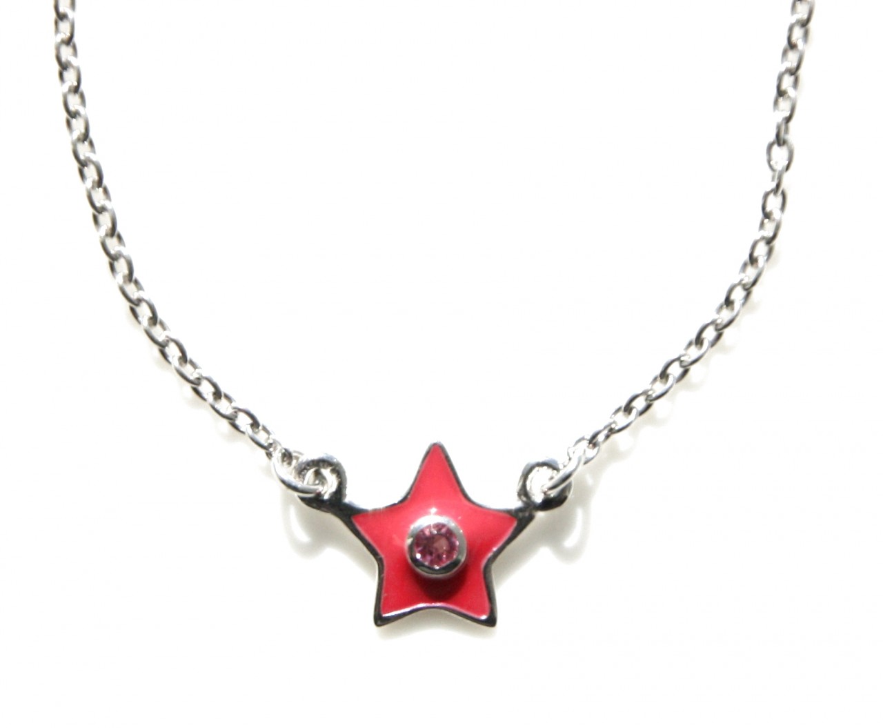 Zilveren kinderketting van ovale schakeltjes met vaste roze emaille sterhanger en in het midden een fonkelend roze steentje. Het kettinkje is in lengte verstelbaar.