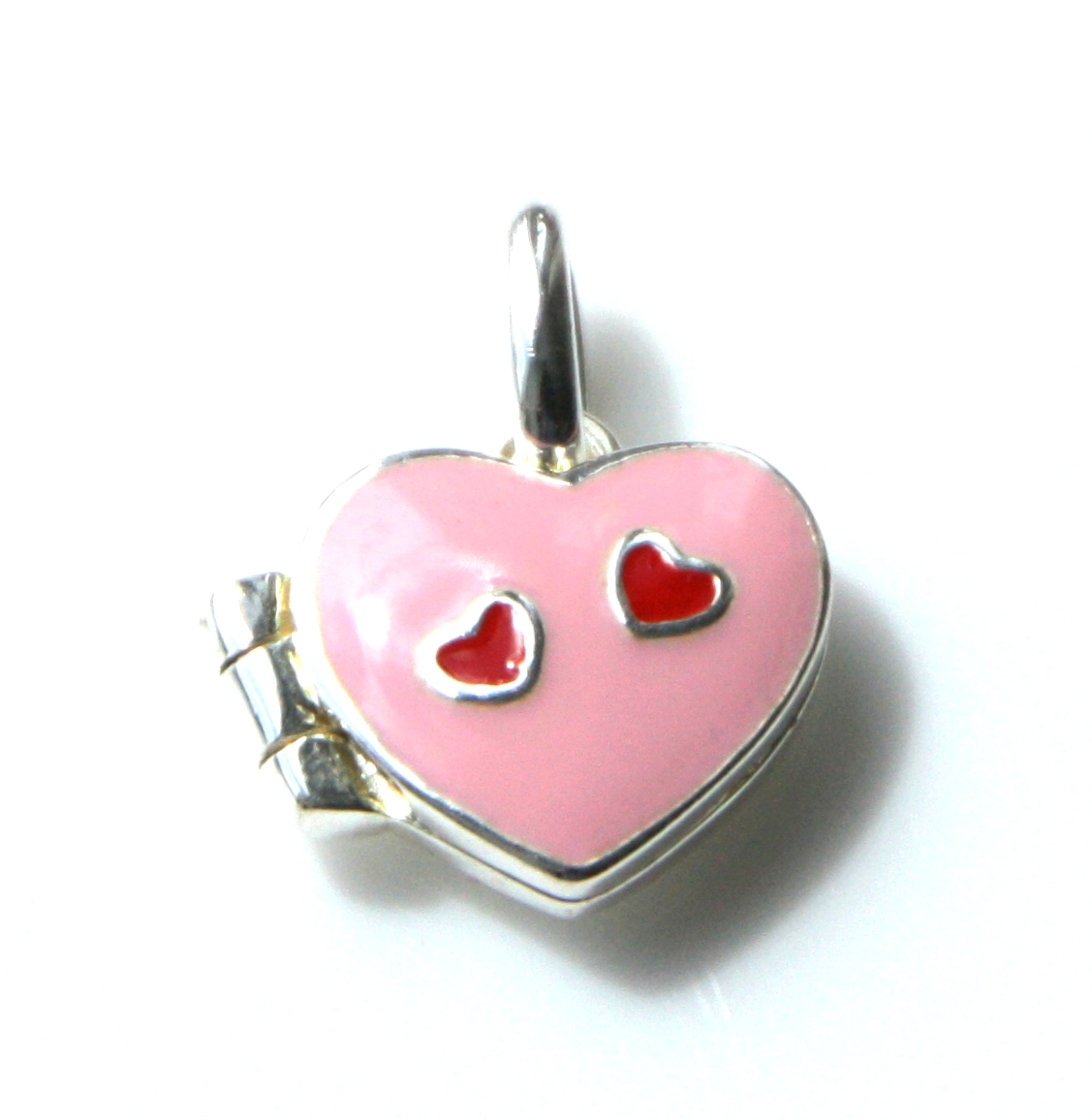 Zilveren kindermedaillon in de vorm van een roze hart afgewerkt met 2 kleine rode hartjes voor het mooi