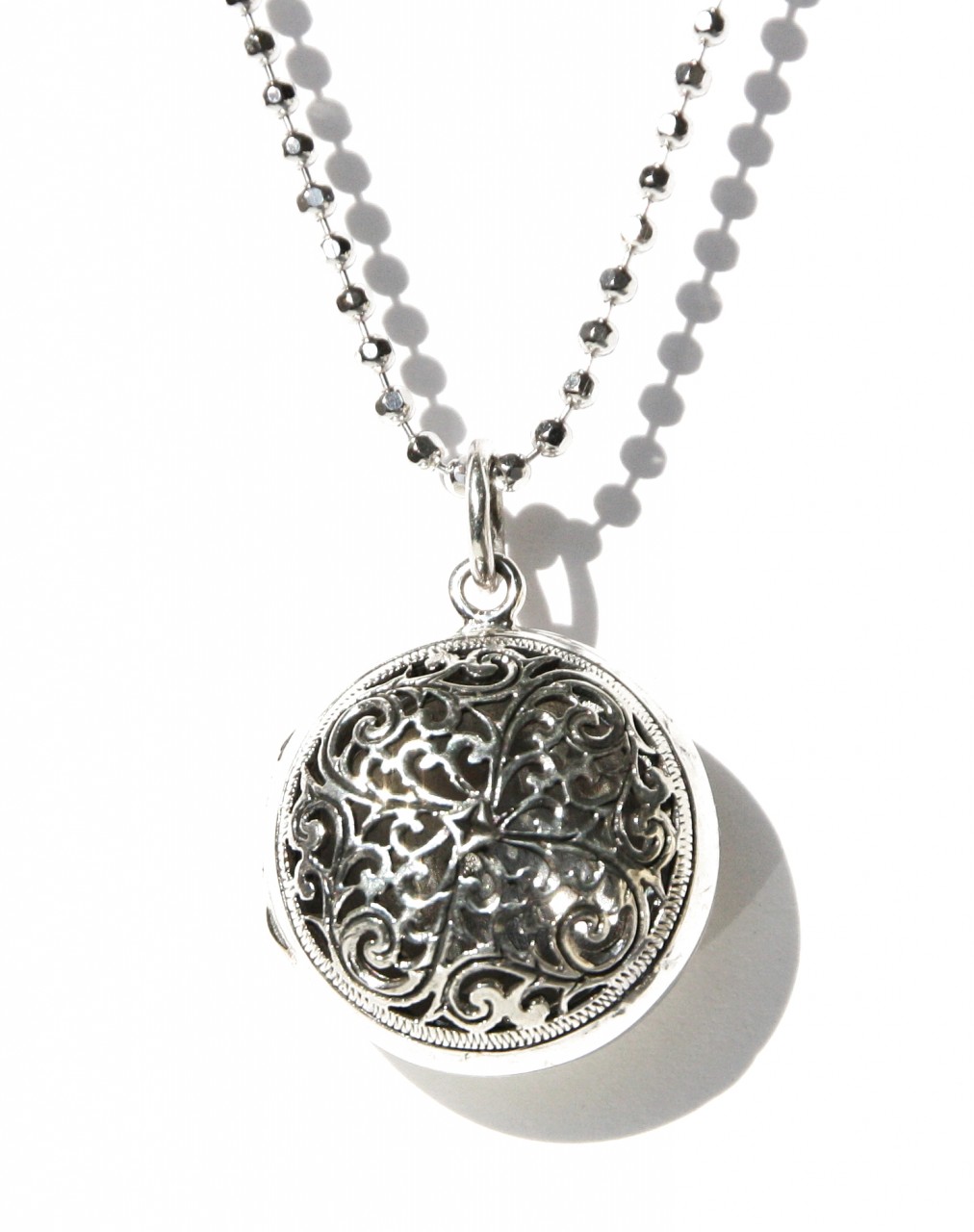 Zilveren medaillon rond. De voorzijde van dit medaillon is fraai opengewerkt en de acherzijde is dicht (egaal zilver).