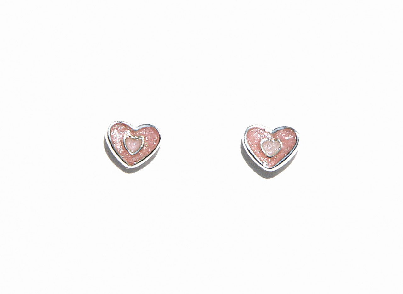 Zilveren kinder oorknopjes hartjes in hartjes met roze glitteremaille.