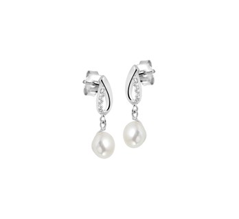 Oorhangers van gerhodineerd zilver met zoetwaterparels en zirkonia. Bijpassende parelhanger is tevens verkrijgbaar.