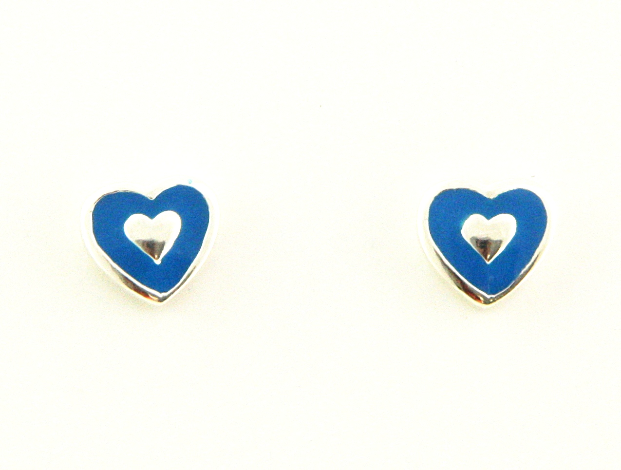 Zilveren oorknopjes met gekleurde emaille hartjes in blauw, paars of roze en in het midden een zilveren hartje.