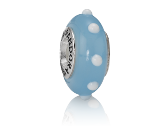 Murano glasbedel van Pandora lichtblauw met witte nopjes. Deze bedel wordt niet meer geproduceerd.