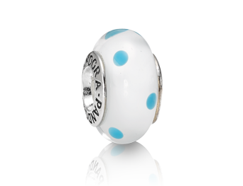 Murano glasbedel van Pandora, wit met turquoise stippen. Deze bedel wordt niet meer geproduceerd.