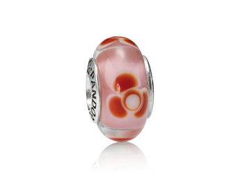 Murano glasbedel van Pandora, roze met rood/witte bloemtjes. Deze bedel wordt niet meer geproduceerd. Nog slechts 1 bedel op voorraad!