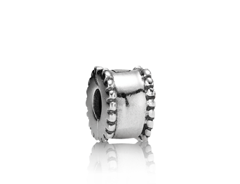 Zilveren clipbedel van Pandora, te gebruiken op de schroefgedeeltes van een Pandora armband. De bedel fungeert zo als stopper voor de andere bedels.